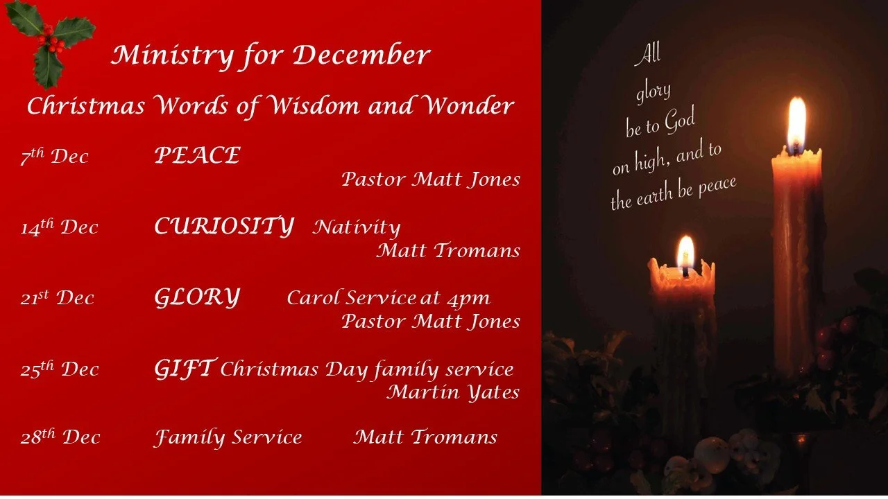 In the other weeks, children are invited to go out to creche and Bible classes from about 11.00am to 12.00pm. (Creche 0-3, Sparklers 4-6, Ignite 7-11)